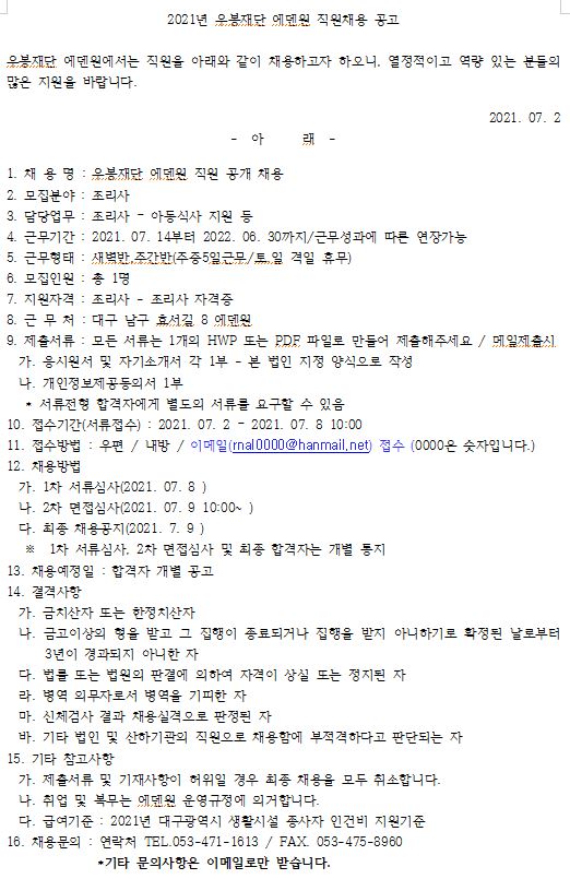 우봉재단 에덴원 조리사 채용 공고