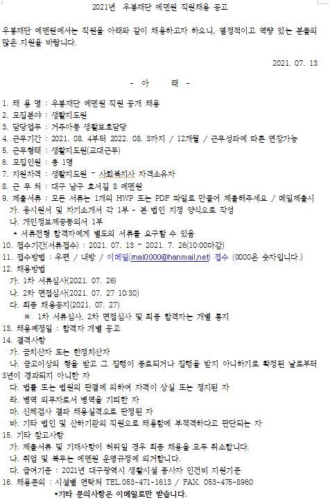 우봉재단 에덴원 생활지도원 모집 공고