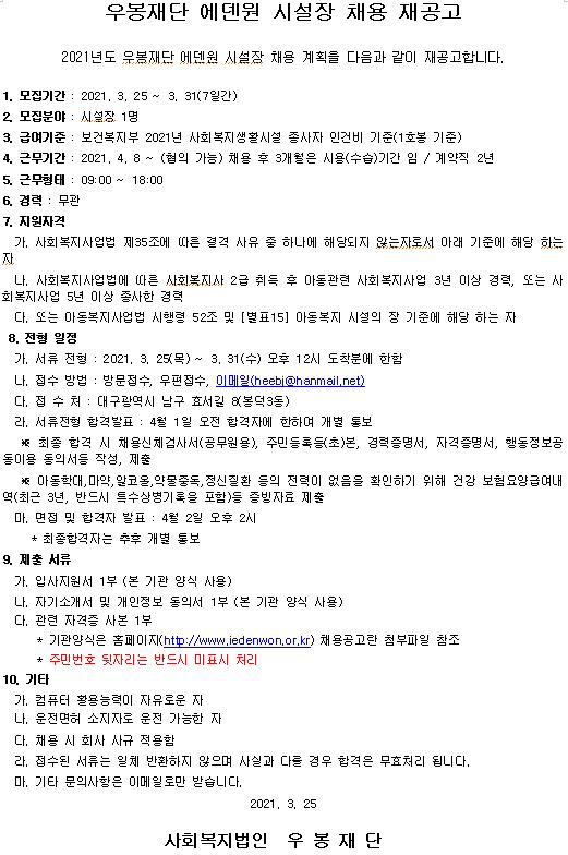 우봉재단 에덴원 생활지도원 및 조리사 채용 공고