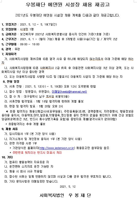 우봉재단 에덴원 시설장 채용 재공고
