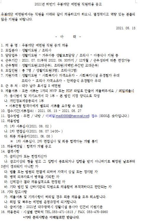 우봉재단 에덴원 생활지도원 및 조리사 채용 공고