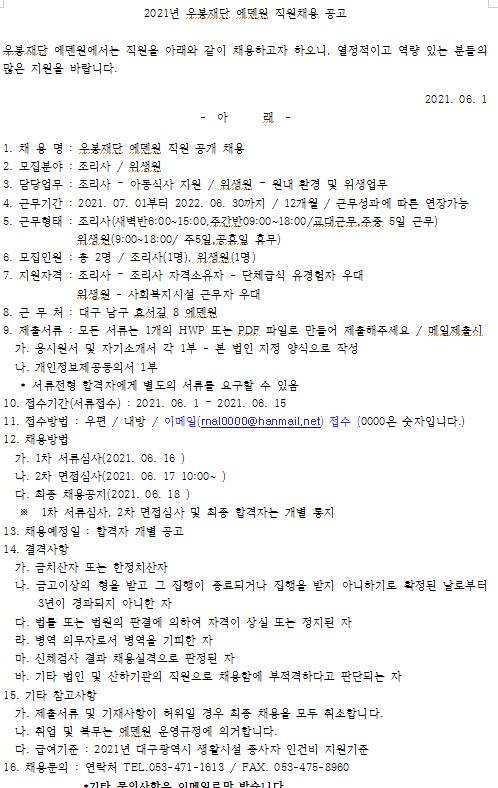 우봉재단 에덴원 조리사 및 위생원 채용 공고