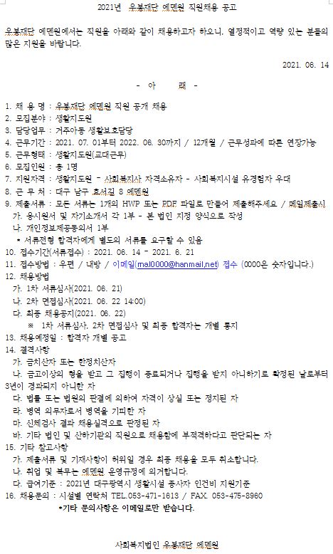 우봉재단 에덴원 생활지도원 및 조리사 채용 공고
