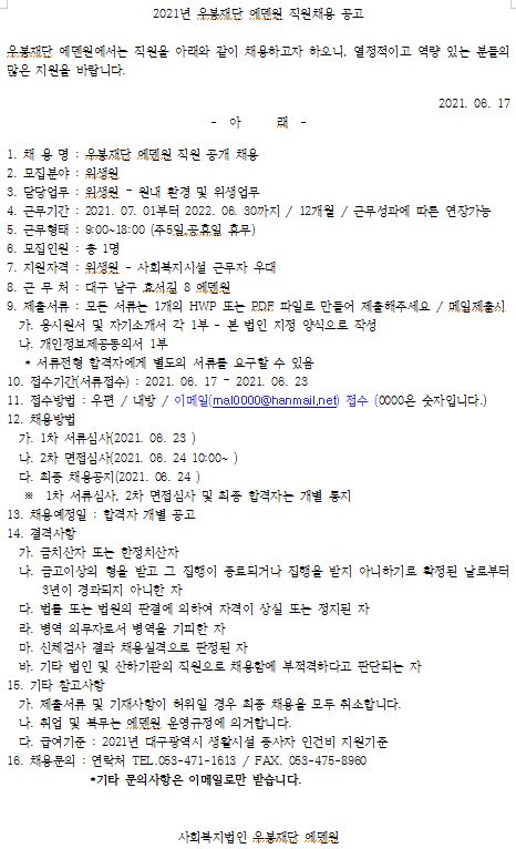 우봉재단 에덴원 조리사 및 위생원 채용 공고