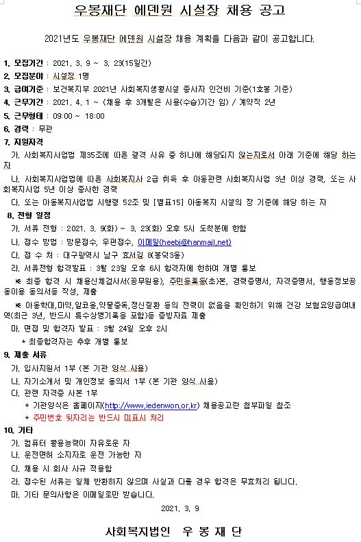 우봉재단 에덴원 시설장 채용공고