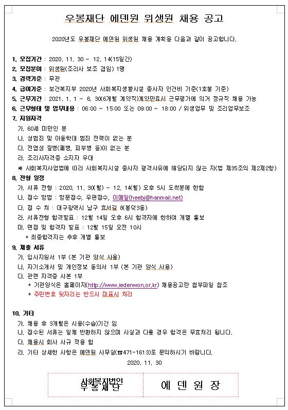 우봉재단 에덴원 위생원 채용공고