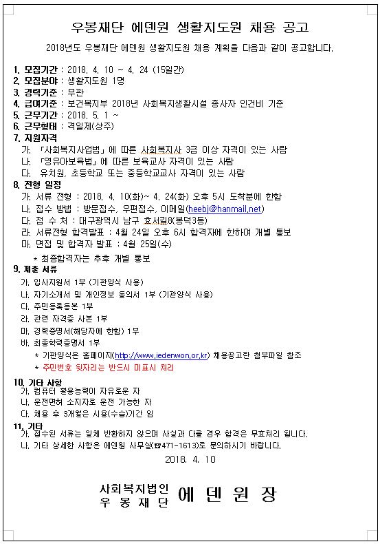 우봉재단 에덴원 생활지도원채용공고