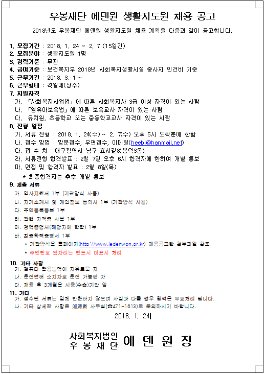 제목: 우봉재단 에덴원 생활지도원채용공고 (재공고)