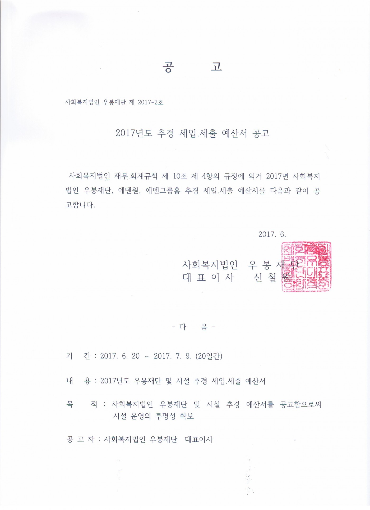 2017년 사회복지법인 우봉재단 2차 추경 세입.세출예산서 우봉재단 0 8751 2017.06.20 17:15 2025.10.23 06:44 2017년 우봉재단 2차 추경예산총괄표.xls.zip (7.8K) + 0 2025.10.23 06:44 2017년 2차 추경 예산서 목록.xlsx.zip (10.7K) + 1 2025.10.23 06:44 2017년 6월 이사회의록.hwp.zip (149.8K) + 0 2017년 사회복지법인 우봉재단 추경 세입.세출 예산서