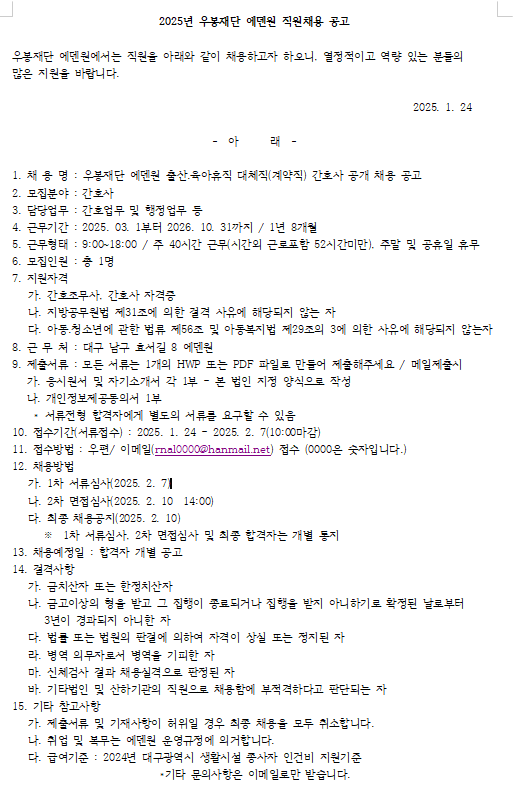 2025년 우봉재단 에덴원 간호사대체직 채용공고결과