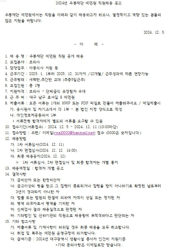 2024년 12.2 우봉재단 에덴원 조리원 채용공고 면접 결과 발표