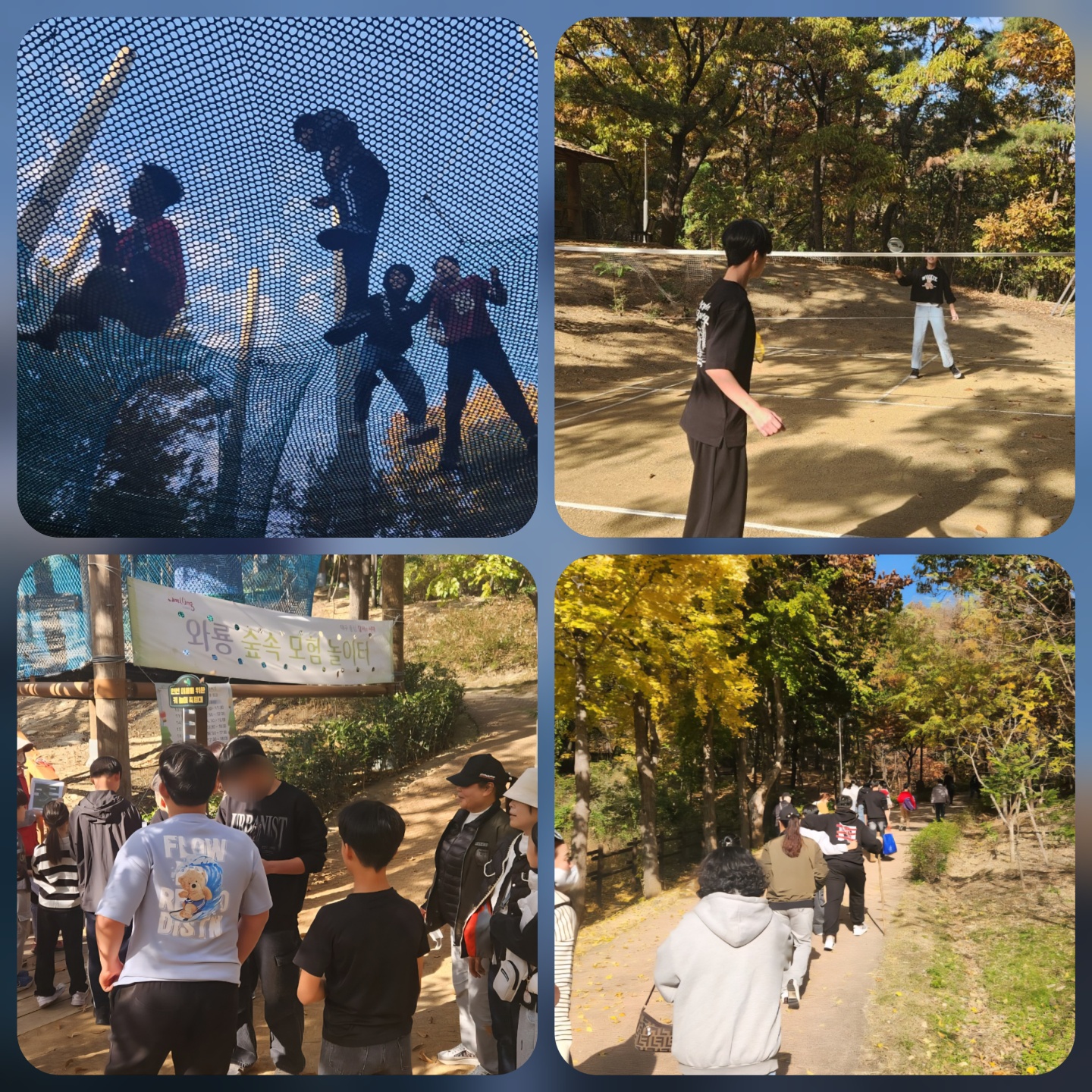 2025년 11월 마음소리 봉사단 우봉재단 0 192 2025.11.30 20:45 11월 마음소리 봉사단과 함께 늦가을 정취를 만끽하려 '와룡 숲속 모험 놀이터'에 방문했습니다.가볍게 등산도 하고, 놀이터의 놀이 기구들을 이용하며 즐거운 한 때를 보냈습니다.^^