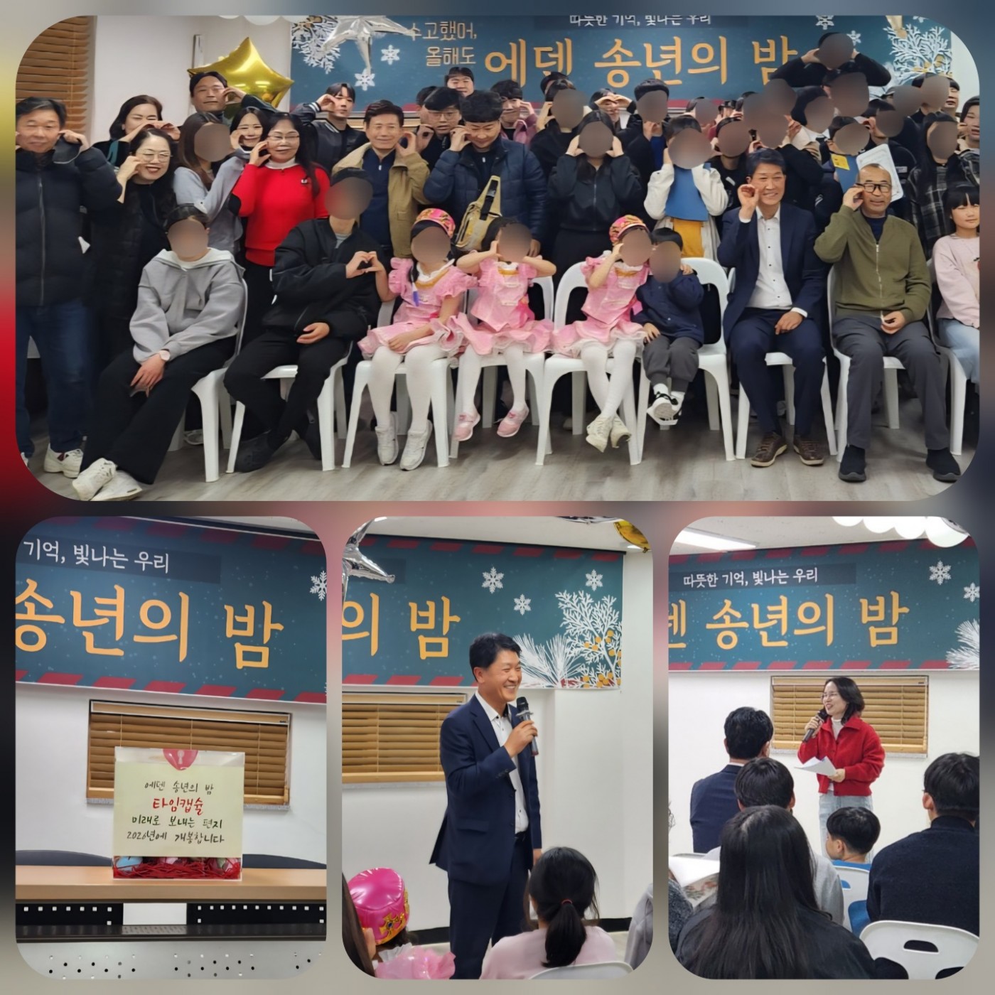 2025년 12월 송년의 밤 우봉재단 0 118 01.17 22:30 에덴원 식구들이 모두 모여 2025년 한해를 돌아 보는 시간을 가졌습니다.일년 동안의 기록고마운 이들에게 전하는 마음들정든 원장님과의 환송식그리고 내년을 기약하는 마음들사랑합니다. 우리 모두를~~^^